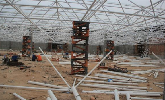 5)总体晋职法:此步履多使用在周边支护以及有多点支护的网架结构,可采取平板升降机、液压千斤顶等小型机具作业图们施工;